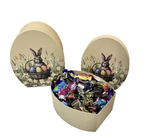 Påskekasse med hare. Luksuriøs kasse i stilfuldt ægformet design med flad bund. To størrelser (0,8 kg eller 1,3 kg) fyldt med smukt indpakkede slik.