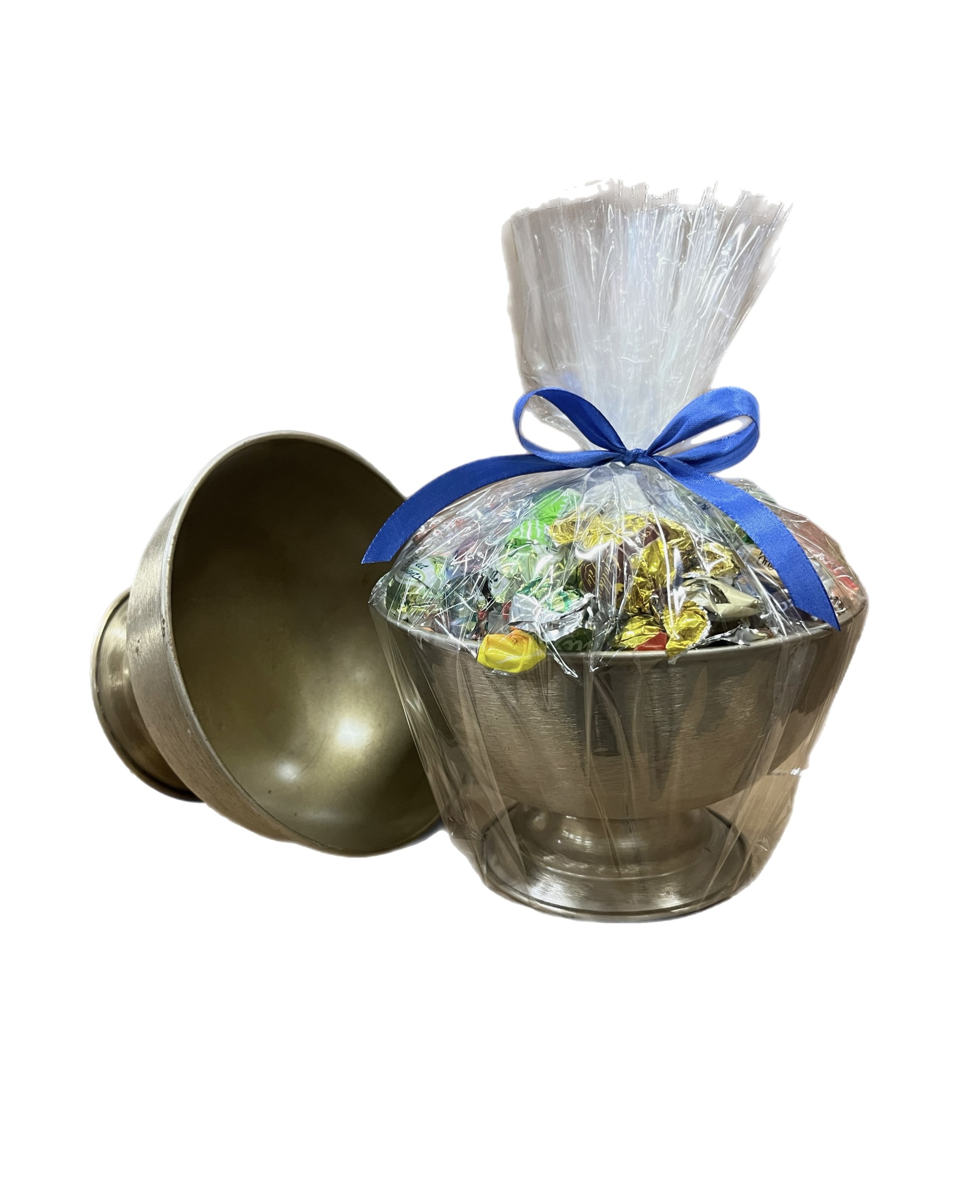 Zomerbeker in messing. Snoepschaaltjes in drie maten in geborsteld messing! Cellofaan verpakt met exclusieve zijden linten.