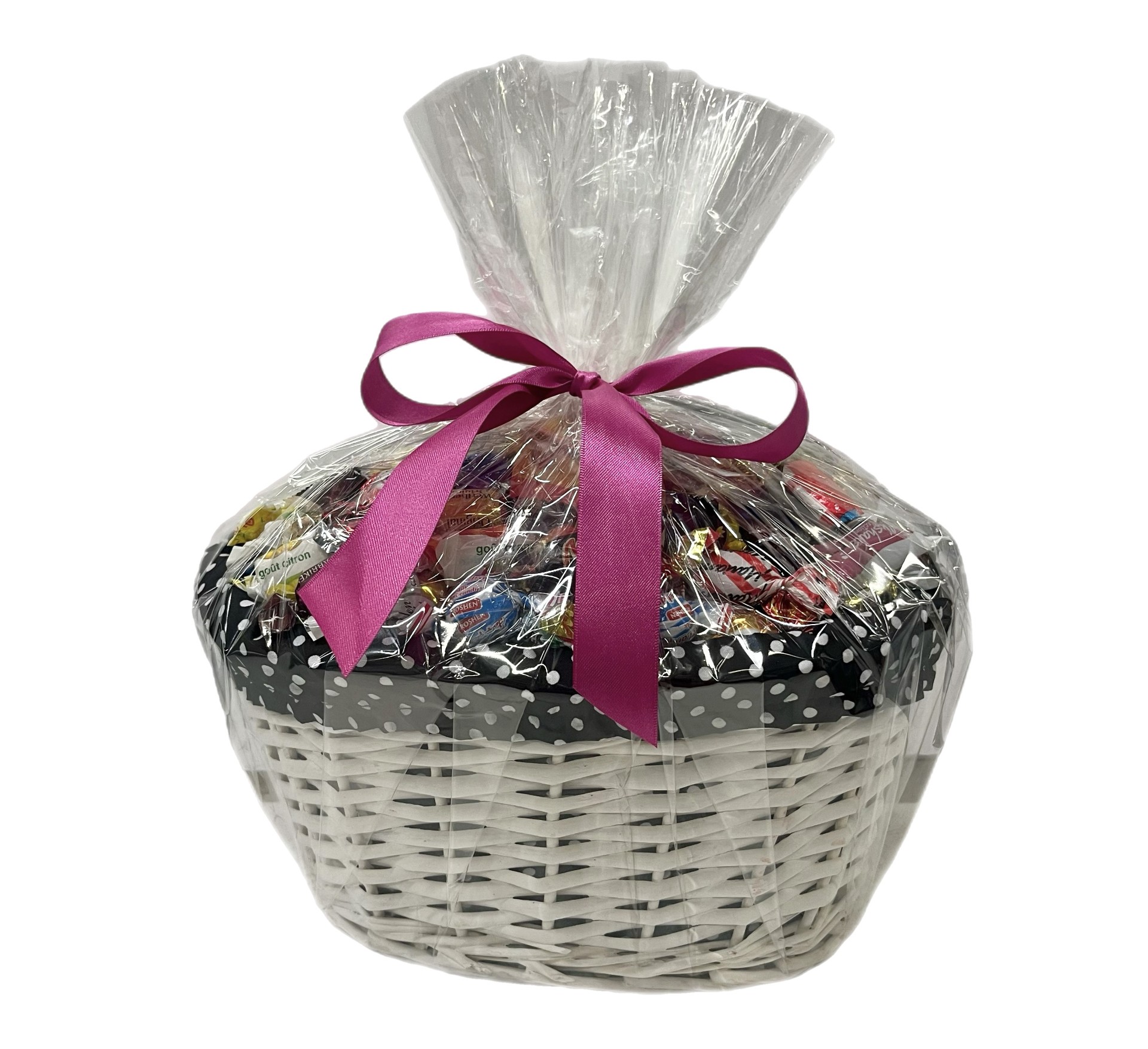 Korg alla hjärtans med tyg! En trevlig godiskorg med insida av svart tyg med vita prickar och fylld med 2,5 kg godis. Perfekt till någon du tycker om.