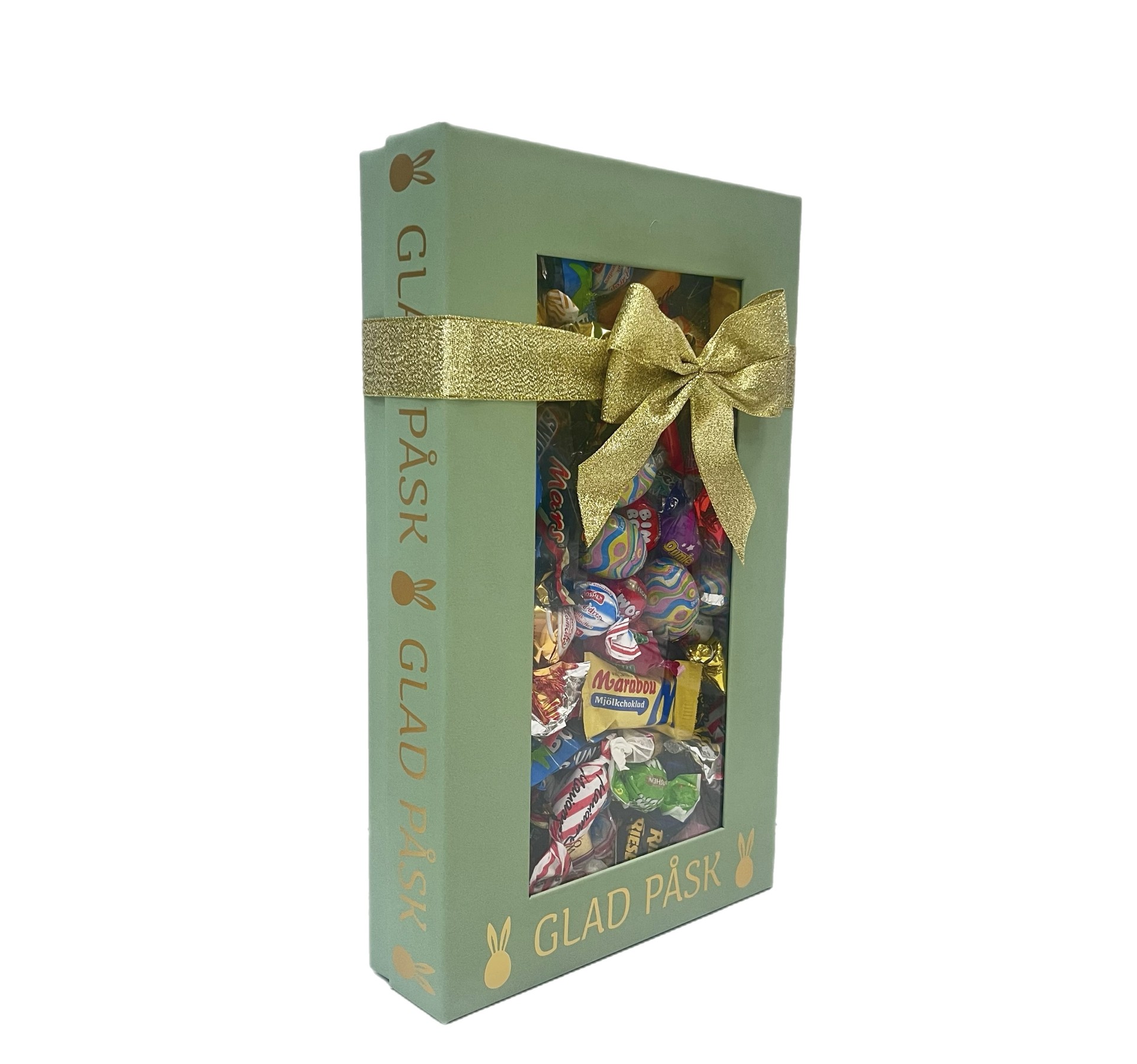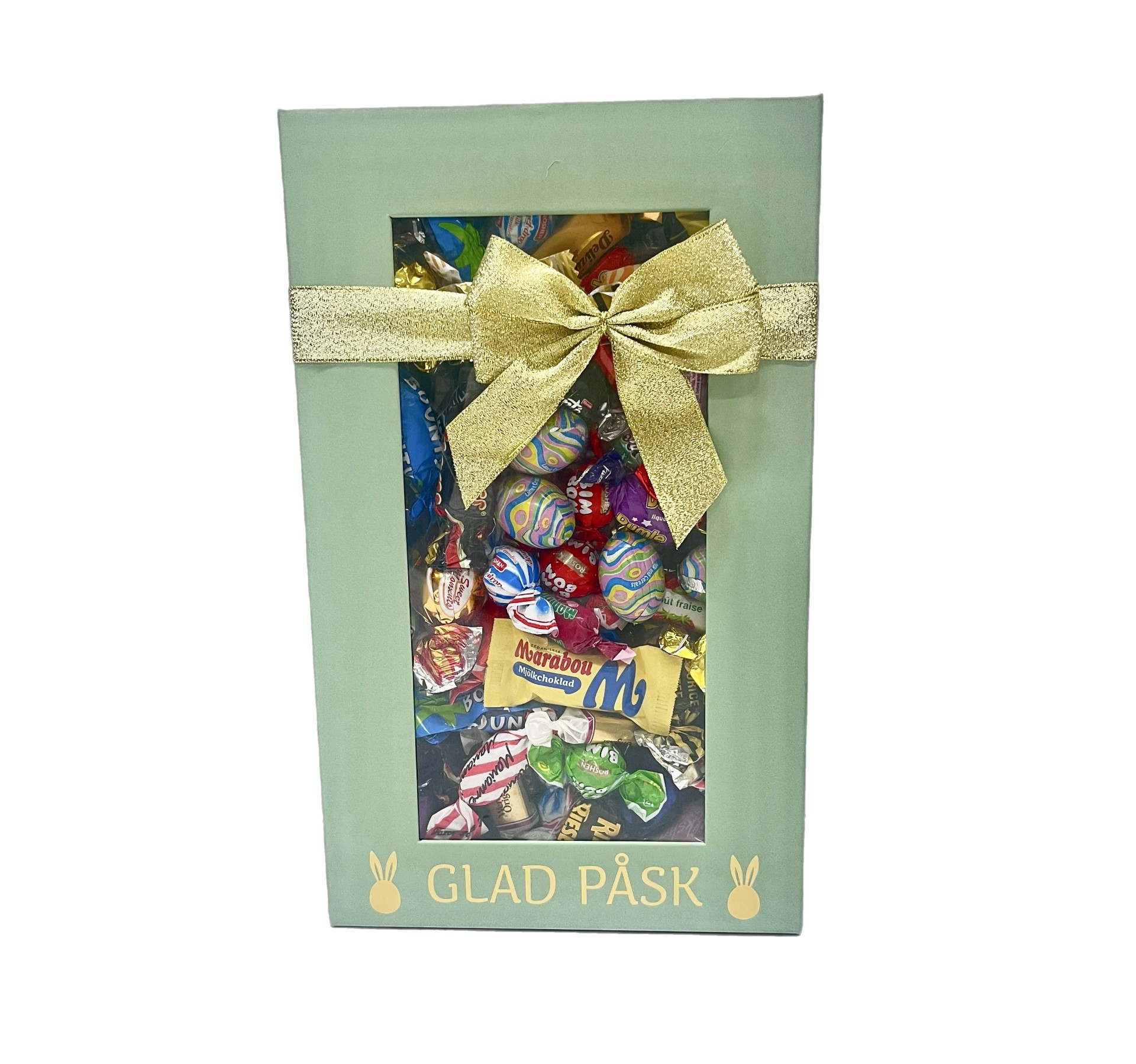 Påsklåda med fönster där vi har valt ut de godissorter som vi tycker är de absolut godaste. Allt godis är med papper på. Våra produkter fylls med godis av högsta kvalité av kända märken. En riktig lyxblandning med andra ord.